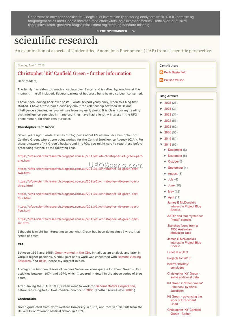 This document is a blog post by Keith Basterfield, dated April 1, 2018, providing further information on the background and activities of Christopher 'Kit' Canfield Green. Green, a former CIA analyst (1969-1985) and medical doctor, is noted for his long-standing interest in UFOs and related intelligence matters. The post details Green's career, including his work at the CIA, his subsequent employment at General Motors, and his return to full-time medical practice in 2005. The author draws heavily from the diaries of Jacques Vallee to describe Green's activities between 1974 and 1979, noting his involvement in various intelligence-related projects and his interactions with other figures in the UFO research community, such as Hal Puthoff and various contactees. A significant portion of the post focuses on Green's post-2005 research project, which involved compiling a database of over 100 patients—many from military or aerospace backgrounds—who suffered from enigmatic injuries, burns, and diseases following 'face-to-face' encounters with UFOs or UAPs. Green hypothesized that these patients were exposed to advanced technologies, such as non-lethal weaponry or cloaking devices. He later collaborated with Dr. Garry Nolan to analyze these patients, identifying potential biomarkers and DNA changes. The document also mentions Green's work with Rendlesham Forest witness John Burroughs regarding medical treatment. The post concludes by referencing Green's involvement in various controversial UFO-related topics, including the Serpo hoax, MJ12, and Project Aquarius, while maintaining a skeptical perspective on many of these claims.