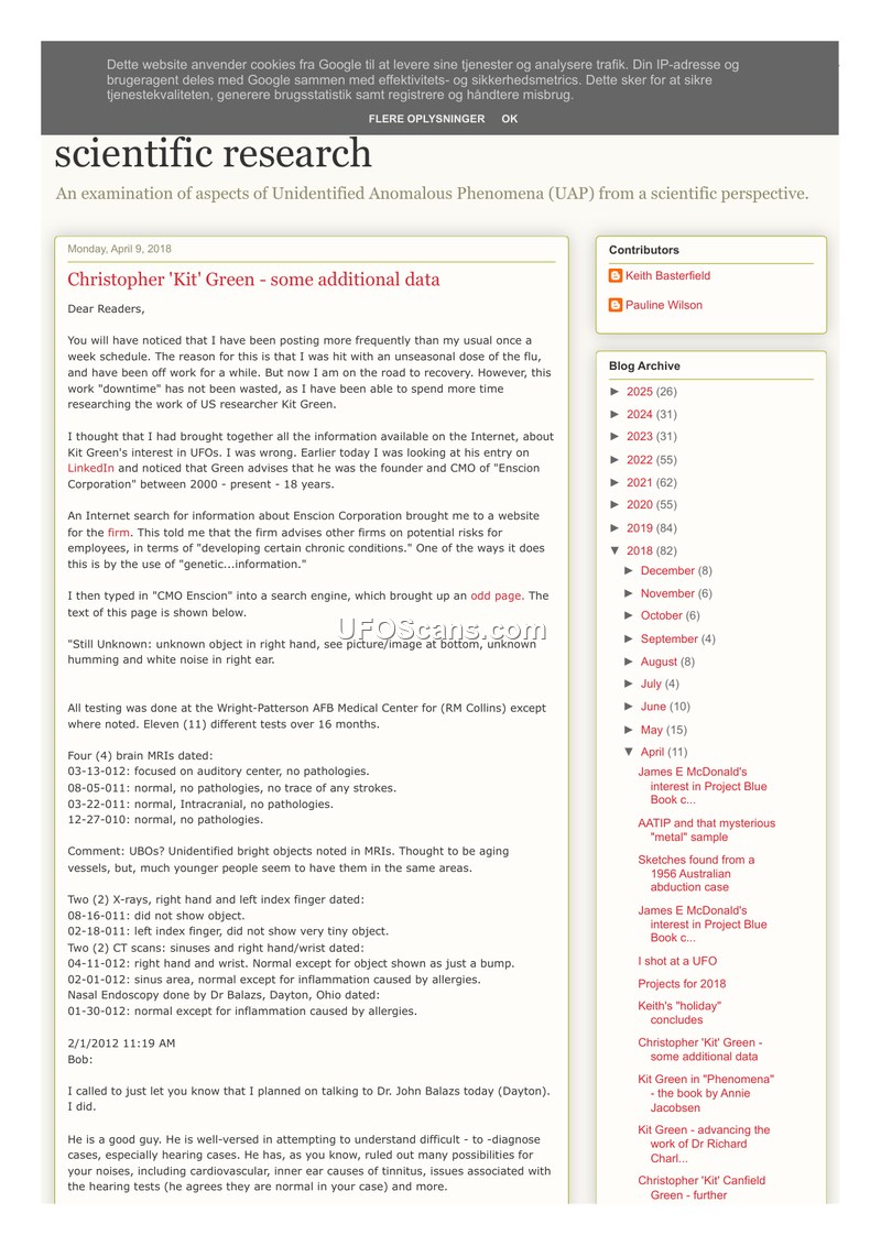 This document is a blog post dated April 9, 2018, authored by Keith Basterfield, which examines data related to researcher Christopher 'Kit' Green and an investigation into an unknown object found in the hand of Robert Michael Collins. The post details a series of medical tests conducted at the Wright-Patterson AFB Medical Center between 2010 and 2012, including brain MRIs, X-rays, CT scans, and an EEG. These tests were performed to investigate an 'unknown object' in the subject's right hand and associated symptoms of humming and white noise in the right ear. The medical results were largely normal, with the exception of the object appearing as a 'bump' on scans. The document includes excerpts from what appears to be an email or report from Kit Green, discussing the object's behavior—specifically that it would 'turn on' every ten seconds and could be activated by a magnet, despite no electromagnetic field being detected by a gauss meter. The author links these findings to the work of Dr. Roger Leir, who studied alleged alien implants. The post also identifies Robert Michael Collins as the individual involved and notes that Kit Green participated in the investigation. The document concludes by questioning the nature of the object and its potential connection to 'hyper burst communications' or quantum teleportation, as suggested in the source material.