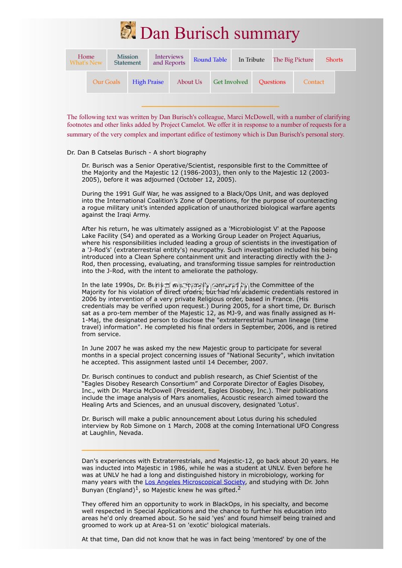 This document provides a biographical summary of Dr. Dan B. Catselas Burisch, written by his colleague Marci McDowell and published by Project Camelot. It details Burisch's career as a Senior Operative and Scientist for the Committee of the Majority and Majestic-12 between 1986 and 2006. Burisch claims to have been involved in high-level black operations, including work at the Papoose Lake Facility (S4) on Project Aquarius. His primary responsibility involved investigating the neuropathy of an extraterrestrial entity referred to as a 'J-Rod,' which he identifies as a future human from a timeline approximately 52,000 years in the future. The text describes Burisch's interactions with the J-Rod, including the collection of tissue samples and a specific incident where the entity 'downloaded' information into his mind. The document also discusses Burisch's involvement with 'Looking Glass' technology, a back-engineered device capable of bending time and space, and his subsequent research into Mars anomalies and the 'Lotus' protocol. Burisch's history includes a formal censure by the Committee of the Majority, the vacation of his Ph.D. credentials, and attempts by the organization to modify his memories. The summary highlights Burisch's role in treaty negotiations regarding extraterrestrial abductions and his eventual retirement. It concludes with an update from January 2008, suggesting Burisch was invited back by a new Majestic group to assist with timeline-related issues, and emphasizes the importance of human free will and unity in navigating potential future catastrophes.