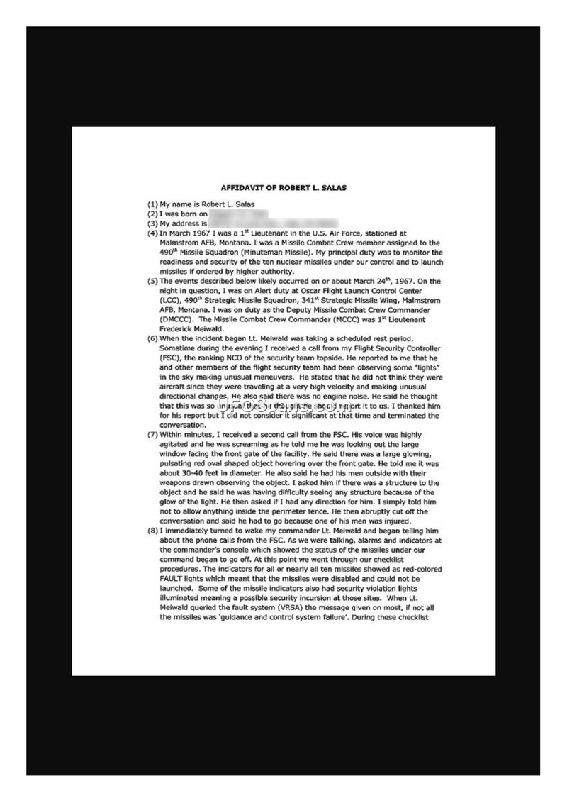 This document is an affidavit provided by Robert L. Salas, a former 1st Lieutenant in the U.S. Air Force. Salas recounts an incident occurring on or about March 24, 1967, while he was serving as a Missile Combat Crew member at the Oscar Flight Launch Control Center (LCC) of the 490th Missile Squadron, 341st Strategic Missile Wing, at Malmstrom Air Force Base, Montana. Salas states that during his alert duty, he received reports from his Flight Security Controller (FSC) regarding unidentified 'lights' in the sky performing unusual maneuvers. The FSC initially reported that the security team observed an object that did not behave like an aircraft, noting high velocity and unusual directional changes. Shortly thereafter, the FSC contacted Salas again, appearing highly agitated. The FSC reported that a large, glowing, pulsating red oval-shaped object, approximately 30 to 40 feet in diameter, was hovering over the facility's front gate. The FSC noted that the object made no engine noise and that security personnel were observing it with their weapons drawn. The FSC also mentioned difficulty discerning the object's structure due to its glow and reported that one of his men had been injured. Following this, Salas woke his commander, 1st Lieutenant Frederick Meiwald. As they discussed the situation, the facility's alarms and indicators triggered, showing that ten nuclear missiles under their control had been disabled. The console displayed red-colored FAULT lights, and subsequent checks of the fault system (VRSA) indicated a 'guidance and control system failure' for the missiles.