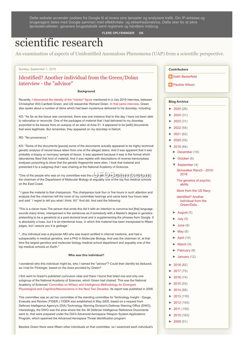 This document is a blog post by Keith Basterfield, dated September 1, 2019, which attempts to identify an anonymous 'advisor' mentioned by Christopher (Kit) Canfield Green in a July 2019 interview with Richard Dolan. In that interview, Green described receiving mysterious packages at his home in Detroit, which contained documents and purported tissue samples from an alien autopsy at Area 51. Green stated that he presented this material to a committee he chaired at the National Academy of Sciences, specifically to a chairperson who was a physician with a PhD in Molecular Biology and a subspecialty in medical genetics. This chairperson reviewed the material and concluded it was an intentional hoax, likely written by someone with a Master's degree in genetics using internet sources. Basterfield cross-referenced the committee members of the National Academy of Sciences' 'Committee on Military and Intelligence Methodology for Emergent Physiological and Cognitive/Neuroscience in the Next Two Decades' (2008) to identify the individual. He concludes that Professor Diane Edmund Griffin, who chaired the Department of Molecular Microbiology and Immunology at the Johns Hopkins Bloomberg School of Public Health, is the most likely candidate, despite noting that he could not find a specific subspecialty in medical genetics for her. The post includes comments from readers, including discussions about the potential for the 'mentor' and 'hoaxer' to be the same entity, and references to a similar document associated with Dan Burisch on the Godlike Productions Forum.