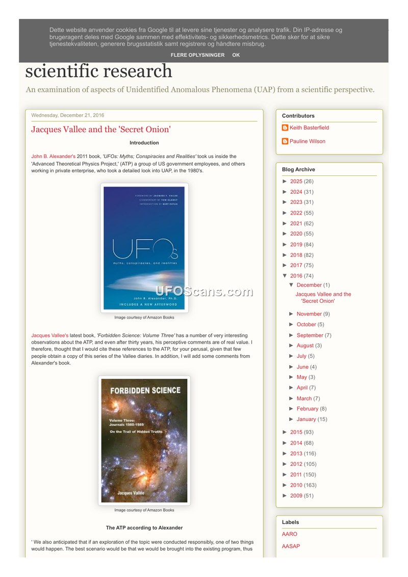 This document is a blog post by Keith Basterfield, dated December 21, 2016, which examines the 'Advanced Theoretical Physics Project' (ATP) and a related, informal initiative referred to as the 'Secret Onion.' The text draws heavily from the books 'UFOs: Myths; Conspiracies and Realities' by John B. Alexander and 'Forbidden Science: Volume Three' by Jacques Vallee. The 'Secret Onion' was a nickname given by Vallee to a high-level, multi-layered project involving US government employees and private enterprise, aimed at investigating UAP in the 1980s. The project was characterized by extreme secrecy, with layers of access, and was intended to gain official status and funding, potentially through the Strategic Defense Initiative (SDI) led by Lieutenant General Jim Abrahamson. The document chronicles the project's struggles, including the premature leaking of information by individuals like Jack Houck, the difficulty in securing official funding, and the eventual reassignment of John Alexander to Los Alamos, which effectively ended the project's momentum. The text also highlights the involvement of various figures, including Hal Puthoff, Dick Haines, and members of the Army Science Board. Despite multiple attempts to revive the project and secure briefings with high-level officials, the initiative ultimately failed to achieve its goals, with Vallee noting that the project was doomed by its own structure and the inability to maintain confidentiality. The document concludes with comments from the author and a reader, providing additional context on the security and personnel involved in the BDM HQ during the mid-1980s.
