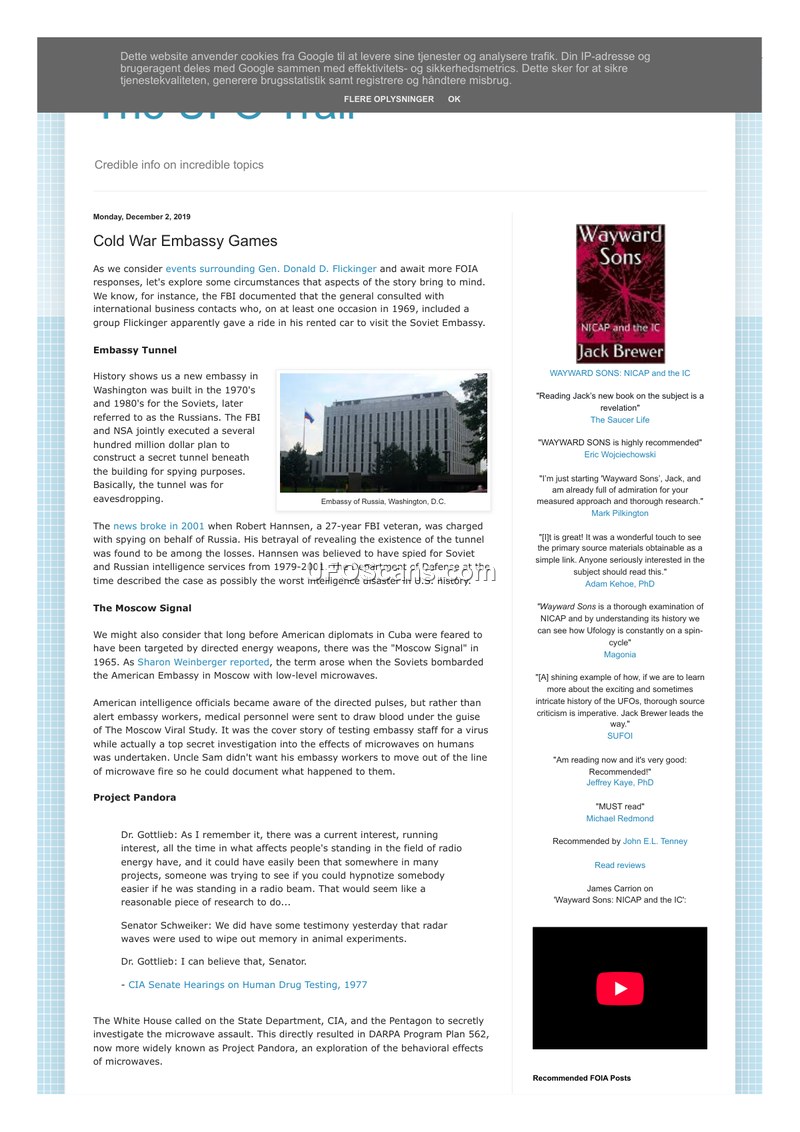 This document, a blog post dated December 2, 2019, by Jack Brewer, explores the intersection of Cold War intelligence operations, microwave research, and UFO-related conspiracy theories. The author examines the 'Embassy Tunnel' incident, where the FBI and NSA constructed a secret eavesdropping tunnel beneath the Soviet Embassy in Washington, D.C., a project revealed by the arrest of FBI veteran Robert Hannsen in 2001. The text also details the 'Moscow Signal' of 1965, where the Soviets bombarded the American Embassy in Moscow with low-level microwaves. Intelligence officials, aware of the pulses, allegedly used a cover story called 'The Moscow Viral Study' to monitor the effects of this radiation on embassy staff without alerting them. This investigation led to the creation of Project Pandora (DARPA Program Plan 562), which explored the behavioral effects of microwaves. The author includes testimony from Dr. Gottlieb and Senator Schweiker during 1977 CIA Senate Hearings on Human Drug Testing, noting discussions about radar waves and potential hypnosis or memory erasure. The document further discusses how this research into non-lethal weapons and electronic frequencies overlaps with UFO lore, citing writers like Anne Keeler and Martin Cannon who have linked reported symptoms—such as disorientation, retinal bleeding, and memory loss—to secret government research. Finally, the author mentions Nick Redfern's discovery of MJ-12 documents within a Department of Defense file on Project Pandora, noting that while these documents are widely considered a hoax, their presence in an official file remains a point of interest.