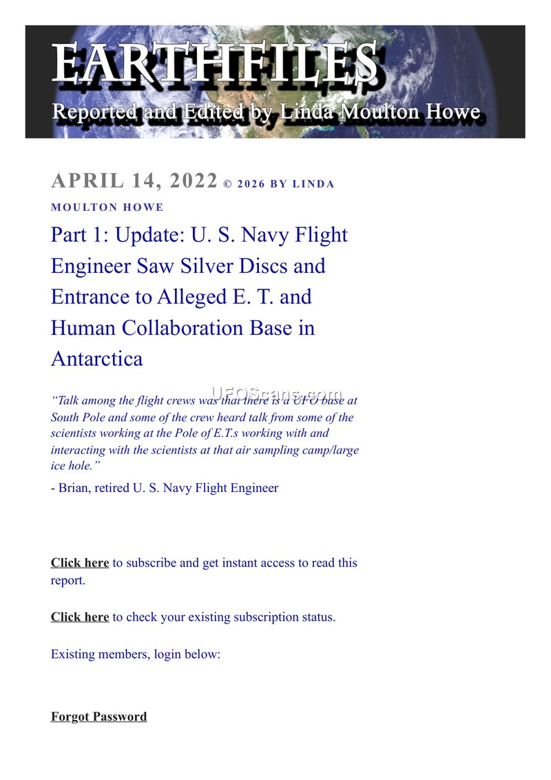 This document, published by Linda Moulton Howe on Earthfiles, details the testimony of a retired U.S. Navy Petty Officer First Class flight engineer identified as 'Brian.' According to the report, Brian claims that during his service, specifically in 1995-1996, he observed silver discs (UAP) while flying near the Transantarctic Mountain range. Furthermore, he reports seeing a large hole in the ice leading to an underground facility located 5-10 miles from the geographic South Pole. Brian states that this area was designated as a no-fly zone, but his crew entered it during an emergency medevac. He describes an encounter with an 'intelligence-gathering' individual who instructed the crew to remain silent about what they had seen. Additionally, Brian alleges that at a camp near Marie Byrd Land, 10-15 scientists disappeared for two weeks and returned appearing visibly frightened. Eighteen months after sharing his account, Brian claims he received an anonymous phone call from a number he later identified as being associated with the NSA in Fort Meade, Maryland, warning him not to discuss the missing scientists or the base.