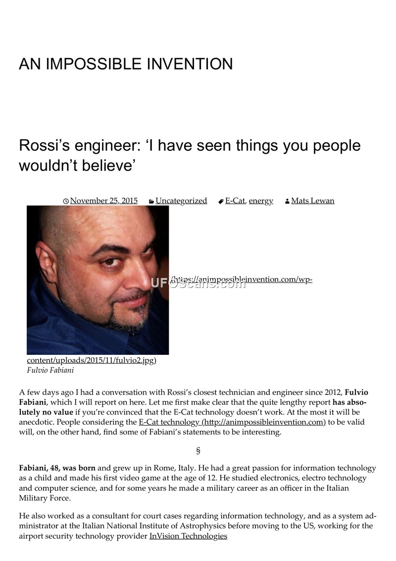 This document is a blog post and interview transcript from November 25, 2015, authored by Mats Lewan on the website 'An Impossible Invention.' The primary subject is Fulvio Fabiani, an engineer who has worked with Andrea Rossi since 2012 on the development of the E-Cat technology. Fabiani describes his background in information technology, electronics, and his previous military service in the Italian Military Force, as well as his work at the Italian National Institute of Astrophysics and InVision Technologies.
