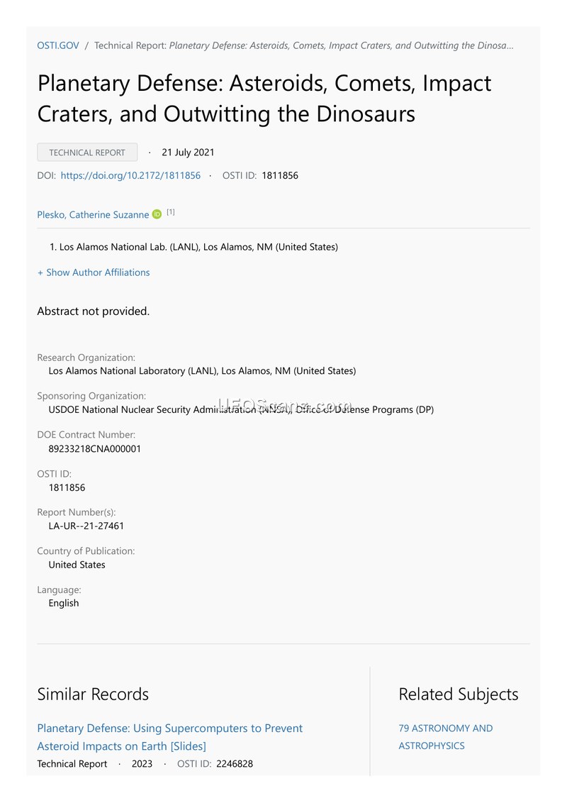 This document is a technical report titled 'Planetary Defense: Asteroids, Comets, Impact Craters, and Outwitting the Dinosaurs,' authored by Catherine Suzanne Plesko of the Los Alamos National Laboratory (LANL). Issued on July 21, 2021, the report is identified by the report number LA-UR--21-27461 and OSTI ID 1811856. The research was sponsored by the USDOE National Nuclear Security Administration (NNSA), Office of Defense Programs (DP), under DOE contract number 89233218CNA000001. The document serves as a formal record of research conducted at LANL regarding planetary defense strategies. While the abstract is not provided in the text, the title indicates a focus on the scientific study of asteroids, comets, and impact craters in the context of planetary protection. The document also lists related records, including studies on using supercomputers to prevent asteroid impacts, the composition of Asteroid 16 Psyche, and the effects of asteroid and comet impacts causing tsunamis.