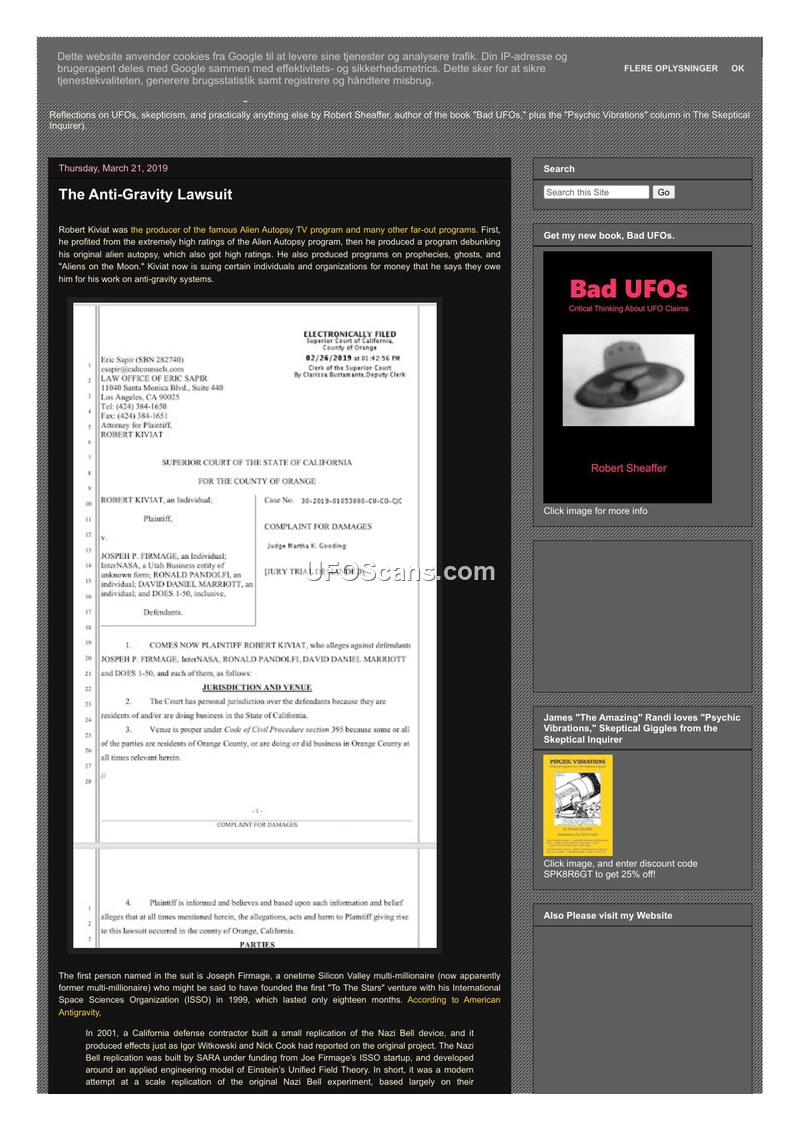 This document is a blog post from 'Bad UFOs' by Robert Sheaffer, dated March 21, 2019, detailing a lawsuit filed by Robert Kiviat against Joseph Firmage. Kiviat, known for producing the 'Alien Autopsy' television program, alleges that Firmage and his company, InterNASA, failed to pay him for his work on anti-gravity research and media projects. The post outlines Firmage's history as a Silicon Valley entrepreneur who founded the International Space Sciences Organization (ISSO) in 1999. Firmage is described as having an interest in fringe science, specifically the 'Nazi Bell' device, which he allegedly funded a replication of through a defense contractor named SARA. The document notes that Firmage's ventures, including One Cosmos, ManyOne Networks, and Motion Physics, were largely unsuccessful. Kiviat claims that he was recruited by Firmage to document an anti-gravity breakthrough, which he later came to believe was part of a disinformation 'flytrap' scheme orchestrated by CIA scientist Ron Pandolfi. The post also mentions Firmage's legal troubles, including multiple arrests for DUI and bankruptcy filings. Sheaffer provides commentary on the lack of evidence for the 'Nazi Bell' and the dubious nature of Firmage's claims regarding faster-than-light travel and gravity control. An update added in April 2023 notes that the lawsuit was dismissed and identifies Brandon Fugal as an investor in Firmage's technologies.