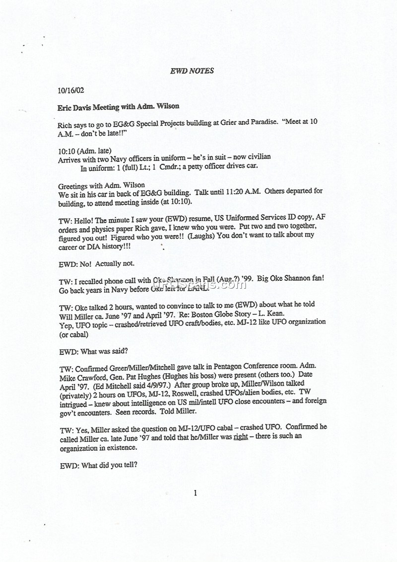 These notes document a meeting held on October 16, 2002, between Dr. Eric W. Davis and Admiral Wilson. The meeting was facilitated by Oke Shannon and followed a previous, controversial interaction between Admiral Wilson and Will Miller in 1997. During the 1997 timeframe, Admiral Wilson, then serving as Deputy Director of the DIA, conducted an investigation into a special projects record group within the Office of the Under Secretary of Defense for Acquisition and Technology (OUSDAT). Wilson describes discovering a highly compartmented, unacknowledged program that was not part of standard Special Access Programs (SAPs). He claims this program was managed by a top aerospace technology contractor and involved the reverse engineering of an intact, non-human craft. Wilson recounts that when he attempted to gain access to this program using his regulatory authority, he was blocked by a 'watch committee' consisting of a security director, a program director, and a corporate attorney. This committee informed him that he did not meet the specific, rigorous access criteria required for the program, regardless of his official position. Wilson was subsequently warned by the Senior Review Group that continuing his inquiry would jeopardize his career, including potential promotion and retirement. The notes also detail Wilson's frustration with Will Miller for disclosing their private conversations to third parties, such as Steven Greer and Linda Moulton Howe, which led to public references to Wilson in the media. The document concludes with a discussion regarding Wilson's interactions with Jacques Gansler and his reluctance to engage further with researchers like Hal Puthoff or Kit Green due to the risks of exposure.