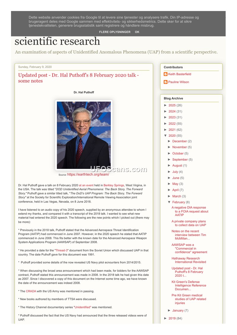This document is a blog post by Keith Basterfield, dated February 9, 2020, providing notes on a presentation given by Dr. Hal Puthoff on February 8, 2020, in Berkley Springs, West Virginia. The talk, titled 'DOD Unidentified Aerial Phenomena: The Back Story, The Forward Story,' updated information previously shared by Puthoff in a 2018 conference. Key updates include the correction of the start date for the Advanced Aerospace Threat Identification Program (AATIP) to June 2008, aligning it with the Advanced Aerospace Weapon System Applications Program (AAWSAP). Puthoff also discussed a 1991 Soviet document regarding UAP, US Navy pilot encounters from 2014/2015, and the existence of 38 Defense Intelligence Reference Documents. The post includes a detailed Q&A session where Puthoff addresses topics such as the potential for warp drive, the use of remote viewing to locate UAP bases, the involvement of Richard Doty, and the authenticity of the 'Wilson document.' Puthoff clarifies that he does not consider UAP to be 'spaceships' and emphasizes that his research follows the data. The document also includes an update from February 20, 2020, where Puthoff clarifies his stance on the Wilson document, stating he did not intend to verify its authenticity. The post concludes with comments from readers discussing various ufology topics, including the SERPO hoax and TTSA's research.