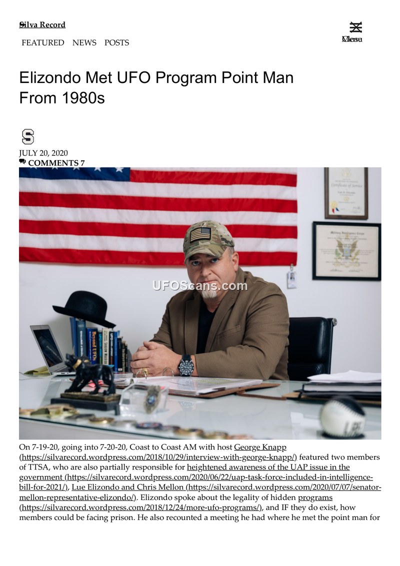 This document, published on the Silva Record on July 20, 2020, details an account provided by Luis Elizondo, a former director of the Advanced Aerospace Threat Identification Program (AATIP), during an appearance on the radio program Coast to Coast AM with host George Knapp. Elizondo recounts a meeting that took place in a SCIF on the Hill, where he was invited to discuss UAP matters at a classified level. During this meeting, an older gentleman, who did not initially introduce himself, approached Elizondo and claimed to have held his specific government position during the 1980s. Elizondo notes that the individual's presence and the reaction of others in the room suggested he was a legitimate figure with a history in the field. The individual stated that the 1980s program did not get as far as the AATIP program, though the specific meaning of this—whether in terms of personnel, political support, or findings—remained unclear to Elizondo. The document highlights this as the first time Elizondo has confirmed the existence of a U.S. government UFO program operating prior to AATIP and AAWSAP. The article also includes commentary from various individuals in the comments section, who discuss the implications of this revelation, referencing other documents such as the Eric Davis/Adm Wilson notes and the broader context of UAP research.