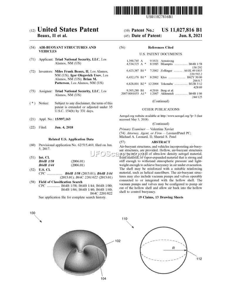 This document is a United States Patent (US 11,027,816 B1) granted on June 8, 2021, to Triad National Security, LLC, for an invention titled 'Air-Buoyant Structures and Vehicles.' The inventors listed are Miles Frank Beaux, II, Igor Olegovich Usov, and Brian M. Patterson. The patent outlines a technology for creating air-buoyant structures that do not rely on traditional lifting gases like helium, which are noted as becoming increasingly expensive and scarce. Instead, the invention utilizes hollow structures with internal cavities maintained under reduced pressure or vacuum conditions. The shell of these structures is constructed from ultra-low density materials such as aerogels, foam, or vapor-expanded materials, which are described as being strong and stiff enough to withstand atmospheric pressure while remaining lightweight. The shell may be reinforced with materials like helical nanofibers. The system includes integrated vacuum pumps and valves that allow for the active control of buoyancy by adjusting the internal pressure. The patent details various geometries for these structures, including torus, spherical, cylindrical, and pill shapes, as well as complex interconnected tube configurations. The document discusses the potential applications for this technology, including balloon-suspended Wi-Fi hotspots, floating warehouses, delivery vehicles, and high-altitude platforms for launching space vehicles. It also provides technical data, including stress-strain graphs for various aerogel materials and tables detailing minimum hoop stresses required for buoyancy at an altitude of 36,090 feet. The patent includes 19 claims defining the scope of the invention, covering both the structures themselves and vehicles incorporating them, as well as the method of using vacuum pumps to maintain buoyancy.
