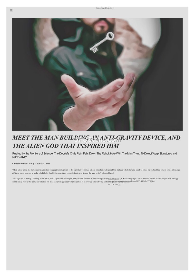 This article from The Debrief, dated June 29, 2021, profiles Mark Sokol, the founder of the New Jersey-based company Falcon Space. Sokol is an autodidact engaged in experimental research into anti-gravity and warp drive technology. His work is heavily influenced by the theories of the late physicist Frederick Alzofon, who worked for Boeing and proposed that inertial mass could be manipulated by orienting subatomic particles. Sokol and his partner, Jeremiah Popp, are attempting to verify these theories through hands-on experimentation, specifically by building a 'Warp Drive Detector' and testing graphite samples using microwave generators to observe potential mass reduction or space-time warping. The article notes that Sokol's approach is unconventional and has been criticized by other engineers, such as David Prutchi, who argue that the experiments are flawed. Sokol acknowledges that his work is theoretical and that he is not a formally trained physicist, but he remains committed to his trial-and-error methodology. Beyond his scientific pursuits, Sokol discusses his belief that the God of the Old Testament, Jehovah, was an extraterrestrial, a conclusion he reached after years of studying religious texts like the Talmud and the Torah. He also expresses interest in the concept of Alien Reproduction Vehicles (ARVs) and suggests that the flight characteristics of UFOs—specifically their lack of barrel rolls and their ability to move at high speeds along a single axis—align with his understanding of anti-gravity physics. Sokol reports that he has secured funding from private investors to continue his research, with the ultimate goal of building a prototype craft within a year or two, provided he can achieve reproducible experimental results that exceed the 'noise floor' of his current equipment.