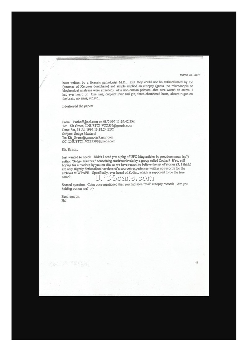 This document consists of an email dated July 31, 1999, sent by an individual named Hal to Kit Green. The correspondence references a previous package of 'UFO Mag' articles sent by the author, which contained pseudonymous stories about crash and retrieval events involving a group referred to as 'Zodiac.' The author inquires if Green has any information regarding these stories or the group 'Zodiac,' which is purportedly associated with WPAFB (Wright-Patterson Air Force Base). Additionally, the author asks Green to confirm a claim previously made by an individual named Colm, who suggested that Green had viewed 'real' autopsy records. The document also includes a brief, detached paragraph at the top, dated March 23, 2001, which describes the destruction of papers related to a forensic pathologist's report on a non-human primate that could not be authenticated.