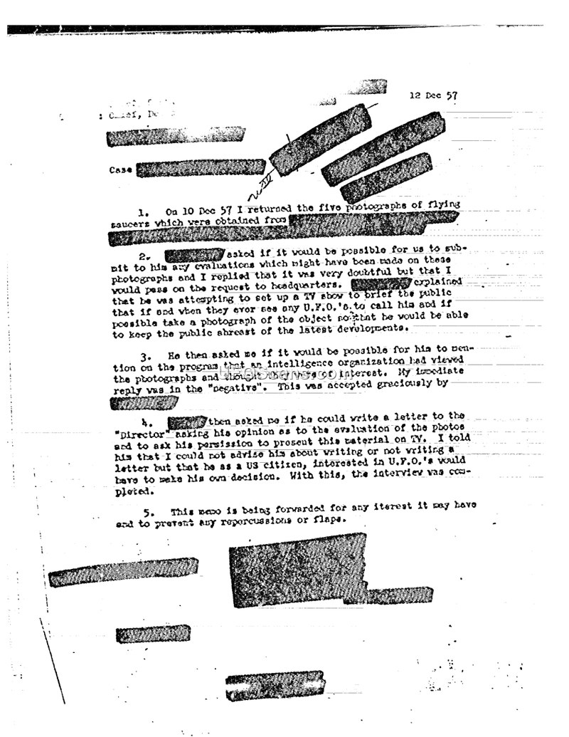 This memorandum, dated December 12, 1957, documents an interaction between an unnamed author and an individual regarding five photographs of flying saucers. On December 10, 1957, the author returned these photographs to the individual. During their interaction, the individual inquired about the possibility of receiving official evaluations of the photographs and sought permission to present the material on a television program intended to brief the public on U.F.O. developments. The author informed the individual that it was highly doubtful that evaluations could be provided and that the request would be passed to headquarters. Furthermore, the author declined to advise the individual on whether to write to the 'Director' for permission to use the photos on television, stating that as a U.S. citizen, the individual would have to make that decision independently. The memorandum concludes by noting that it is being forwarded to address potential interest and to prevent any repercussions or flaps.