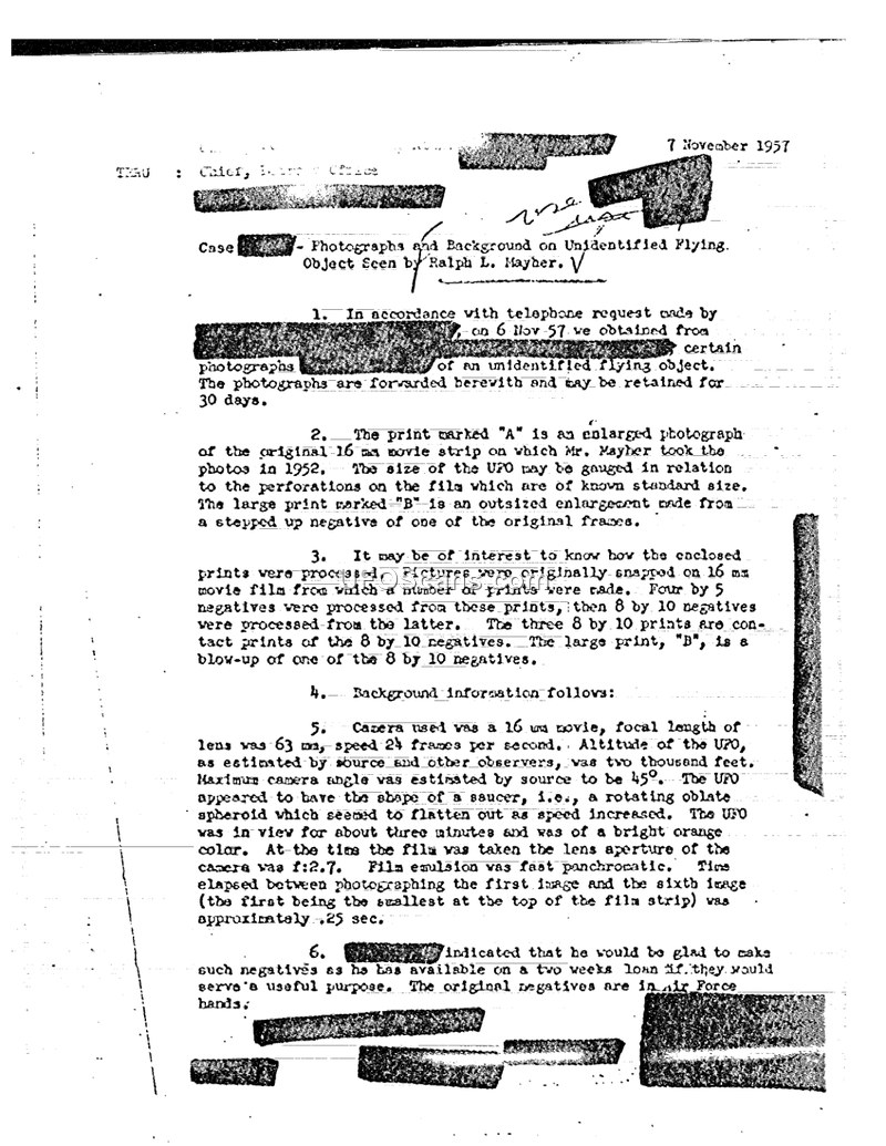 This document, dated 7 November 1957, serves as a transmittal record regarding photographic evidence of an unidentified flying object. The correspondence references a telephone request made on 6 November 1957, resulting in the submission of certain photographs for review. The photographs were derived from a 16mm movie strip originally filmed by Ralph L. Mayher in 1952. The document details the processing of these images, noting that the original film was used to create various prints and enlargements, including a specific print marked 'A' and an enlarged print marked 'B'. Technical specifications regarding the original filming are provided, indicating that the camera used was a 16mm movie camera with a 63mm focal length, operating at 24 frames per second. The object was estimated by the source and other observers to be at an altitude of 2,000 feet. The UFO was described as a saucer-shaped, rotating oblate spheroid that appeared to flatten as its speed increased. The object was observed for approximately three minutes and was noted to be of a bright orange color. The camera settings included a lens aperture of f:2.7 and the use of fast panchromatic film emulsion. The time elapsed between the first and sixth frames of the film strip was approximately 0.25 seconds. The document concludes by noting that the individual involved was willing to loan the negatives for a two-week period if deemed useful, and that the original negatives were currently in Air Force hands.