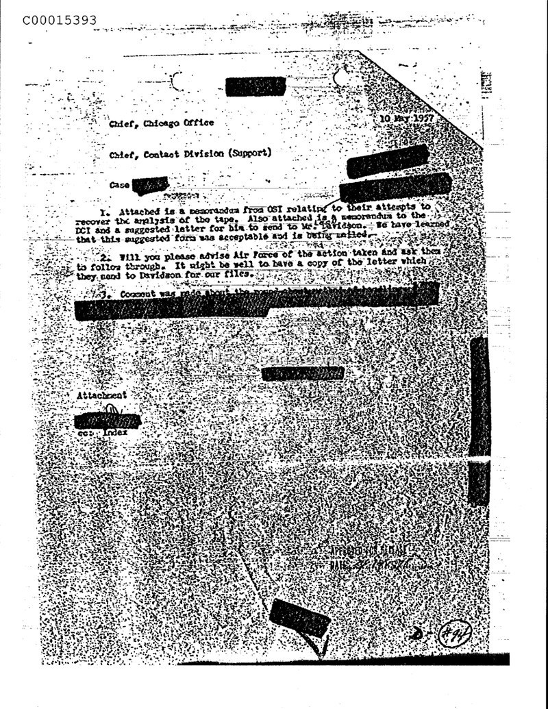 This memorandum, dated 10 May 1957, is addressed from the Chief of the Contact Division (Support) to the Chief of the Chicago Office. The document concerns efforts by the Office of Special Investigations (OSI) to recover the analysis of a tape. The author notes that a memorandum from the OSI is attached, along with a memorandum intended for the Director of Central Intelligence (DCI) and a suggested letter to be sent to a Mr. Davidson. The author confirms that it has been learned that the suggested form of the letter is acceptable and is being utilized. The document further requests that the Chicago Office advise the Air Force of the actions taken and ask them to follow through, suggesting that it would be beneficial to obtain a copy of the letter sent to Mr. Davidson for their own files.