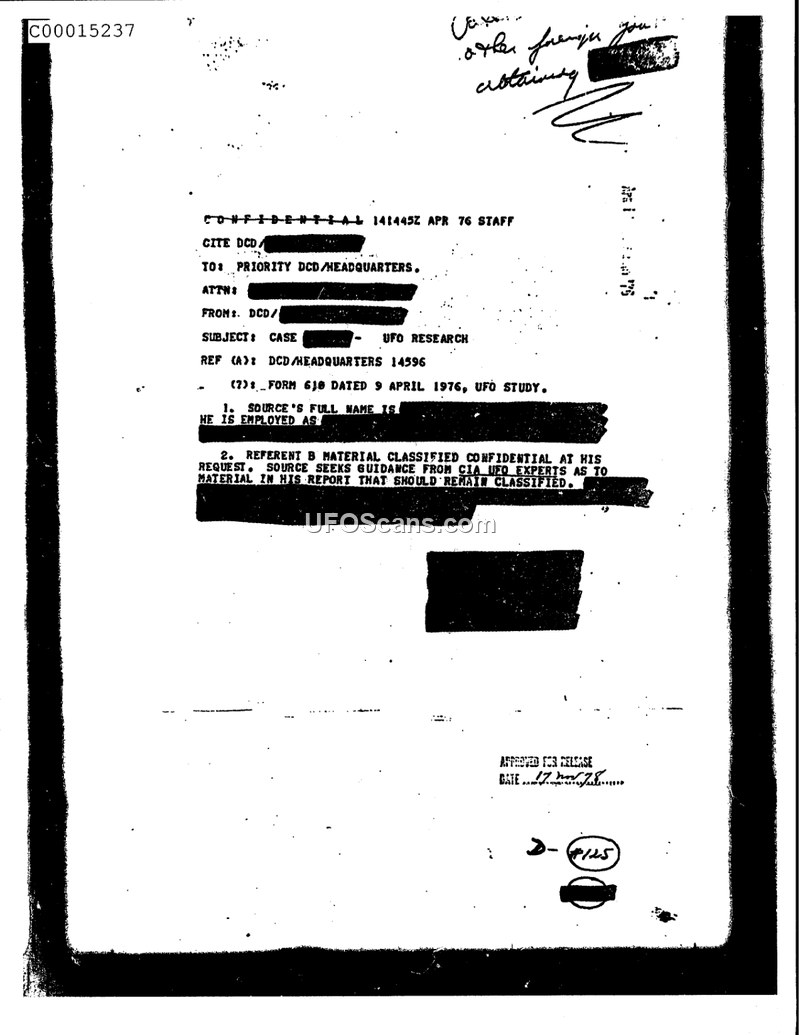 This memorandum, dated 14 April 1976, originates from the DCD and is addressed to DCD/Headquarters. It references a previous communication (DCD/Headquarters 14596) and a UFO study form dated 9 April 1976. The document serves to acknowledge that an unnamed source, who is employed in a capacity that requires the classification of their report, is requesting guidance from CIA UFO experts. The source specifically asks for advice on which portions of their report should remain classified. The document itself is marked as CONFIDENTIAL and contains significant redactions regarding the identity of the source and the specific nature of their employment.