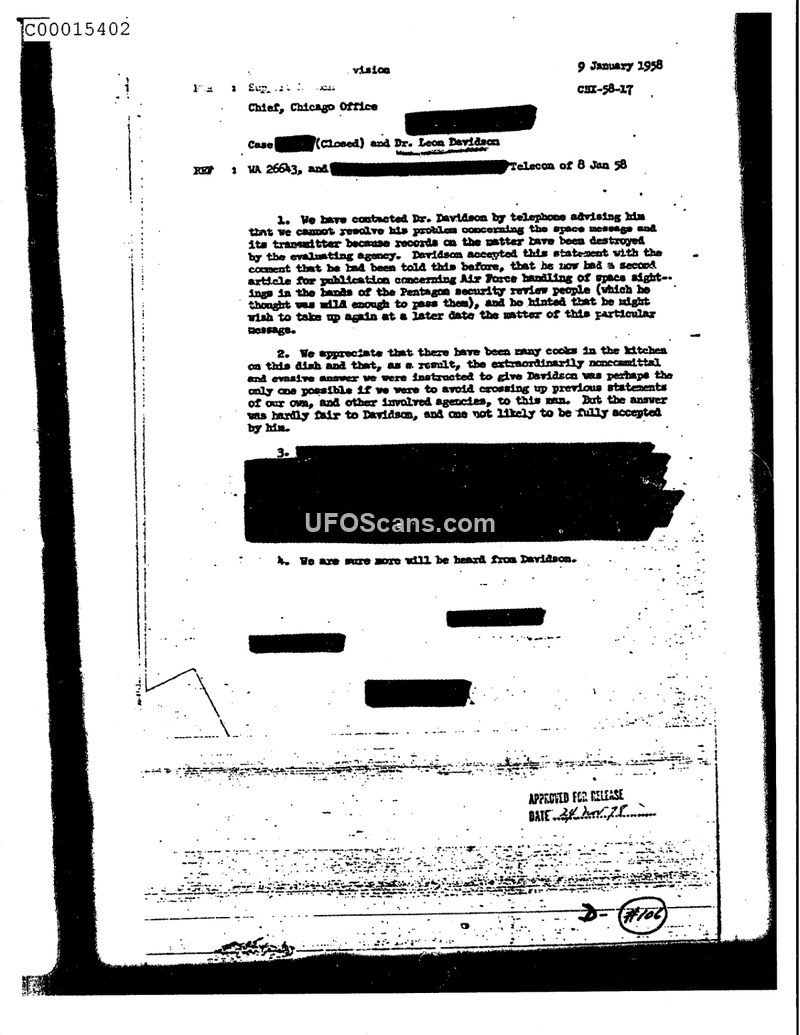 This memorandum, dated January 9, 1958, from the Chicago Office, details a telephone communication with Dr. Leon Davidson. The primary purpose of the contact was to inform Dr. Davidson that the agency was unable to resolve his inquiry regarding a specific space message and its transmitter, as the records pertaining to the matter had been destroyed. During the conversation, Dr. Davidson acknowledged this information, noting that he had previously been told the same. He further disclosed that he had prepared a second article concerning the Air Force's handling of space sightings, which was currently under review by security personnel at the Pentagon. The author of the memorandum expresses frustration with the handling of the situation, noting that there have been 'many cooks in the kitchen' and that the resulting evasive answers provided to Dr. Davidson were not fair to him and were unlikely to be accepted. The document concludes with the expectation that further communication from Dr. Davidson is likely.