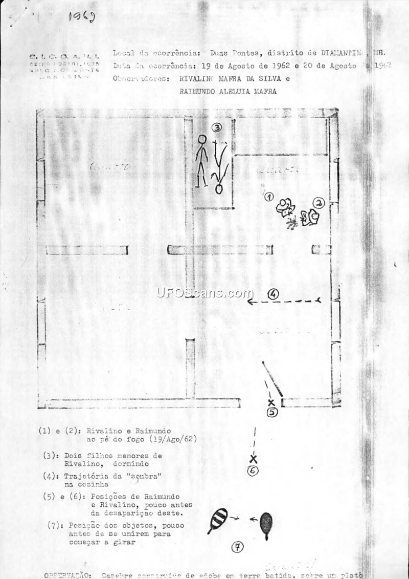 This document details the 'Duas Pontes' case, involving the disappearance of Rivalino Mafra da Silva in August 1962 in the district of Diamantina, Minas Gerais, Brazil. The primary witness, his 12-year-old son Raimundo, reported that on the night of August 19, 1962, his father observed a mysterious 'shadow' with four legs and a 'topknot' moving through their home. The following morning, August 20, Raimundo witnessed two small, oval-shaped objects, approximately 40-50 centimeters in diameter, resting on the ground outside their home. One object was matte black, while the other was striped black and white. Both featured tubular appendages. According to Raimundo, when his father approached the objects, they collided with a dull sound, began to spin, and generated a whirlwind of yellow dust that enveloped Rivalino. Rivalino was never seen again. The document notes that a local official, Antônio Rocha, had reported seeing 'two balls of fire' in the area the week prior. Although a skeleton was discovered near the site in 1963, the author of the report, H. Brant Aleluia, questions the circumstances of this discovery, noting that the rapid decomposition of the body into a clean skeleton within six months is inconsistent with natural processes in an area exposed to scavengers. The report concludes that the case remains unresolved and that conventional explanations—such as the father fleeing or being a victim of a crime—fail to account for the specific details provided by the witness and the physical anomalies observed at the scene.