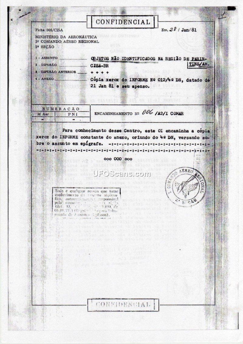 A 1980 sighting report from the Brazilian Navy regarding unidentified luminous objects observed on the Amazon River. The objects were seen by the crew of the corvette 'MEARIM' but were not detected by radar.