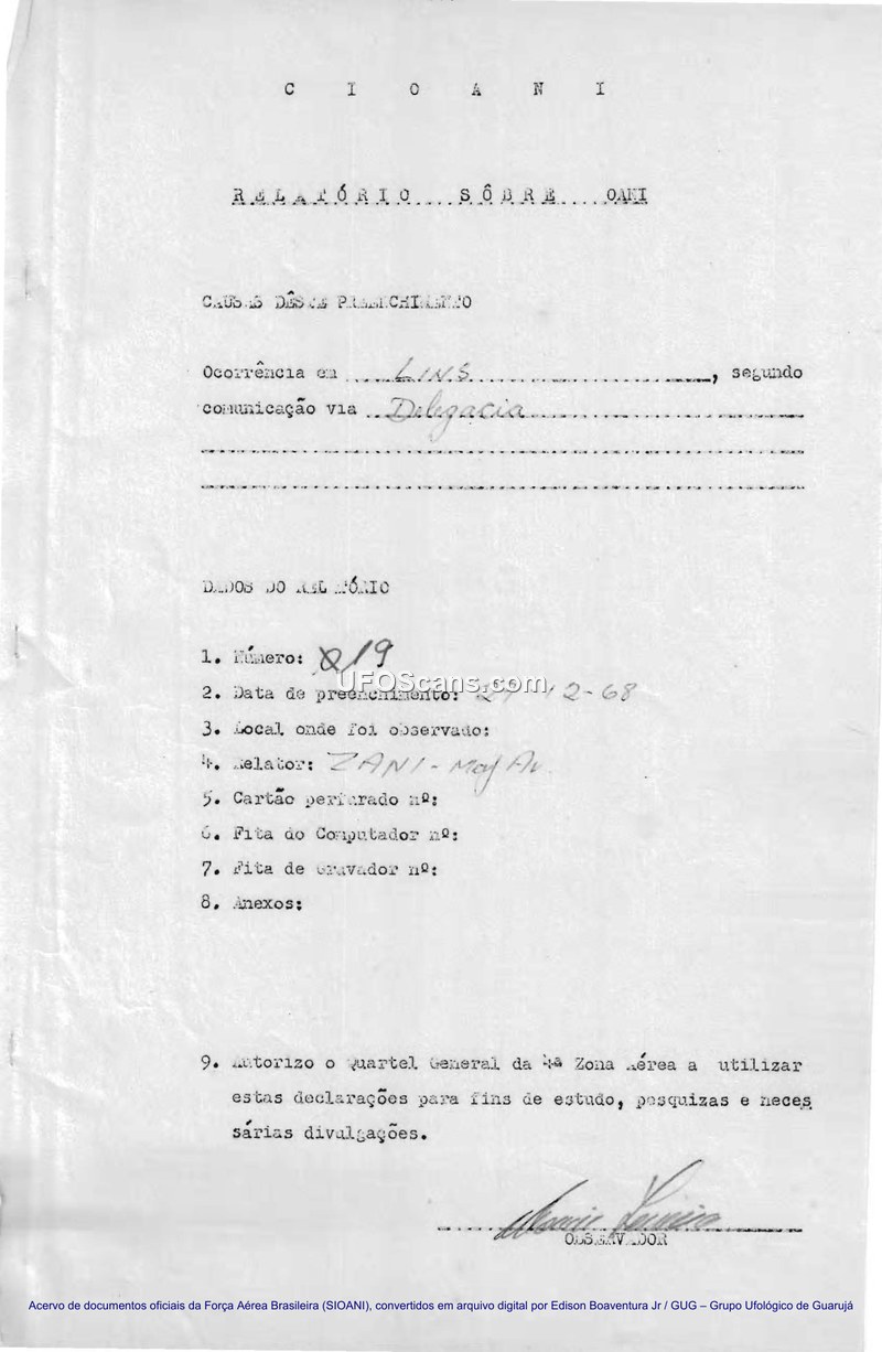 Relatório Sobre OANI (Report on UAP) — Incident #219, Lins, SP, 1968