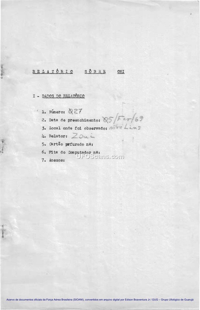 A 1969 SIOANI report detailing a sighting of an ovoid, metallic aerial object in Lins, Brazil. The witness reported the object hovered and performed an ascending maneuver after displaying intermittent red lights.
