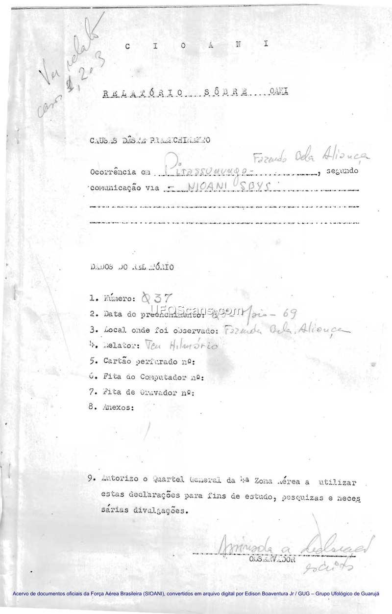 This document is a formal SIOANI (Sistema de Investigação de Objetos Aéreos Não Identificados) report, numbered Q37, detailing an Unidentified Aerial Phenomenon (OANI) sighting that occurred on the night of February 19, 1969, at Fazenda Bela-Aliança in Pirassununga, São Paulo, Brazil. The report includes testimony from several witnesses, including Antônio José Fiocco and his family. According to the accounts, a reddish, round object resembling two stacked basins appeared over a cotton plantation. The object emitted an intense light that dazzled the witnesses and caused local street lights to fail. The object hovered, moved, and eventually ascended suddenly without making any sound, heading toward the city of Pirassununga. The following day, investigators examined the site and discovered physical traces, including flattened cotton plants and circular holes in the ground approximately 18 centimeters in diameter, distributed in a radius of about 3 meters. The report includes sketches of the object and the site, as well as detailed witness statements taken by 1st Lieutenant Augusto Hilmário Siqueira in the presence of other Air Force officers. The document serves as a primary record of the investigation, documenting the physical evidence and the consistency of the witness accounts.