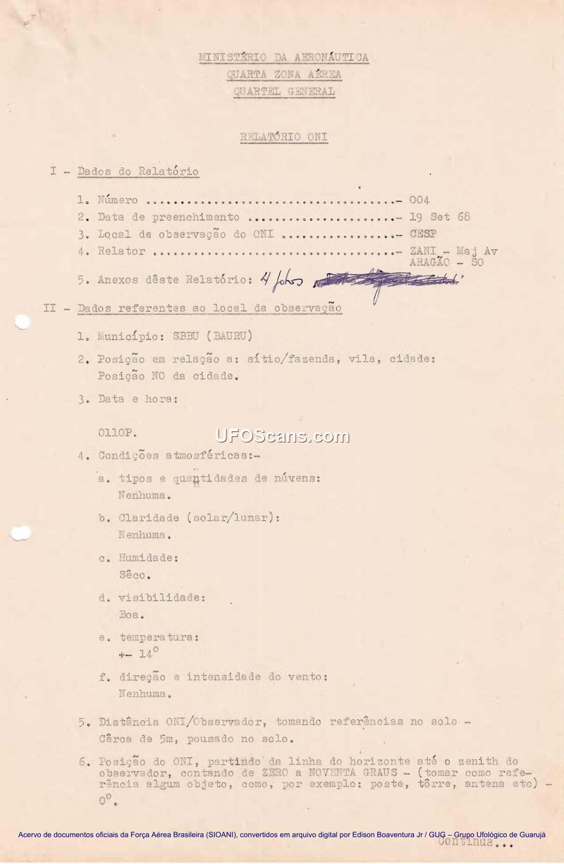 A 1968 Brazilian military report detailing a close encounter between a night watchman and an unidentified craft with three human-like occupants. The witness engaged in a physical struggle with the occupants before the craft departed.