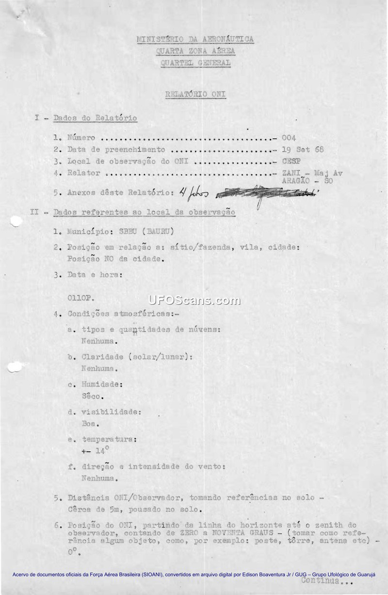 This report, designated as document 004 and dated September 19, 1968, details a sighting and alleged physical encounter with an Unidentified Aerial Phenomenon (ONI) in Bauru, Brazil. The witness, a 22-year-old night watchman named Daildo de Oliveira, reported observing a craft measuring approximately 5 meters in height and 3 meters in diameter, described as having the shape of a 'Kombi' van with the front facing upward. The object was light blue in color. According to the report, the witness had a prior encounter with the occupants, who were described as human-like in appearance and clothing. During the incident, the witness engaged in a physical struggle with the occupants, who reportedly immobilized him without the intent to cause injury. The witness stated that the occupants entered the craft, which then departed, moving in a northwest direction before turning southwest and finally west, accompanied by a sound described as 'frying'. The report notes that the witness was working his rounds at the time and that the weather conditions were clear and dry. The document includes a mention of four photographs as enclosures.