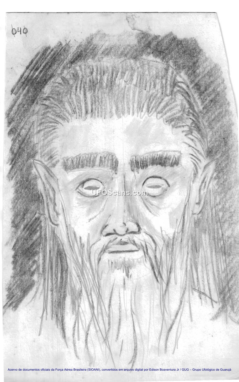 This document consists of two pages, each containing a pencil sketch of an entity, identified as part of the official document collection of the Brazilian Air Force (SIOANI). The sketches were converted into digital format by Edison Boaventura Jr. of the GUG (Grupo Ufológico de Guarujá). The first page provides a frontal view of the entity, while the second page provides a profile view. The entity is depicted with long hair, a beard, and pointed ears. The document is marked with the reference number '040'. No further descriptive text or narrative report is provided within the document pages.