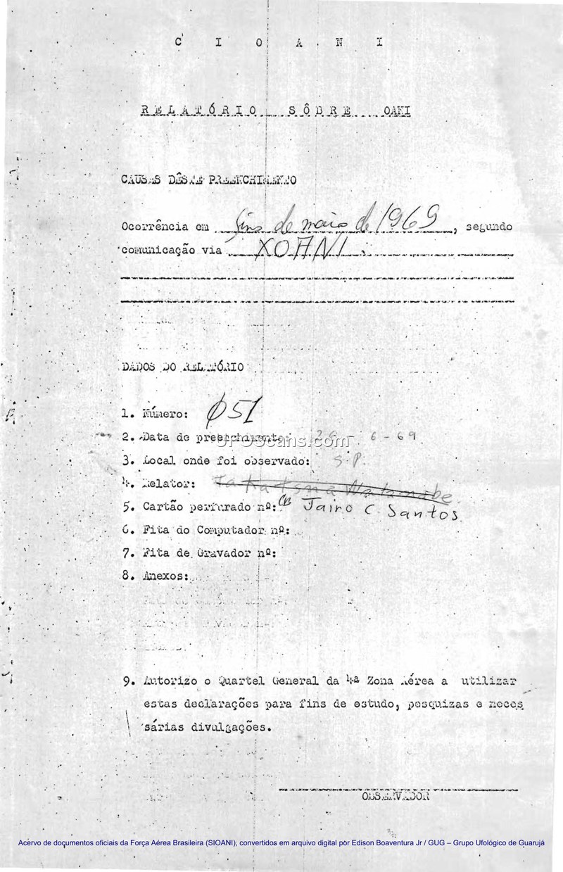Era aprox 24,00 hs quando foi chamado por alguns amigos que, ao número aprox de 10, divisavam sobre a Igreja de S. Judas, um ob. luminoso de forma circular, que emitia fachos de luz vermelha e facho branco.