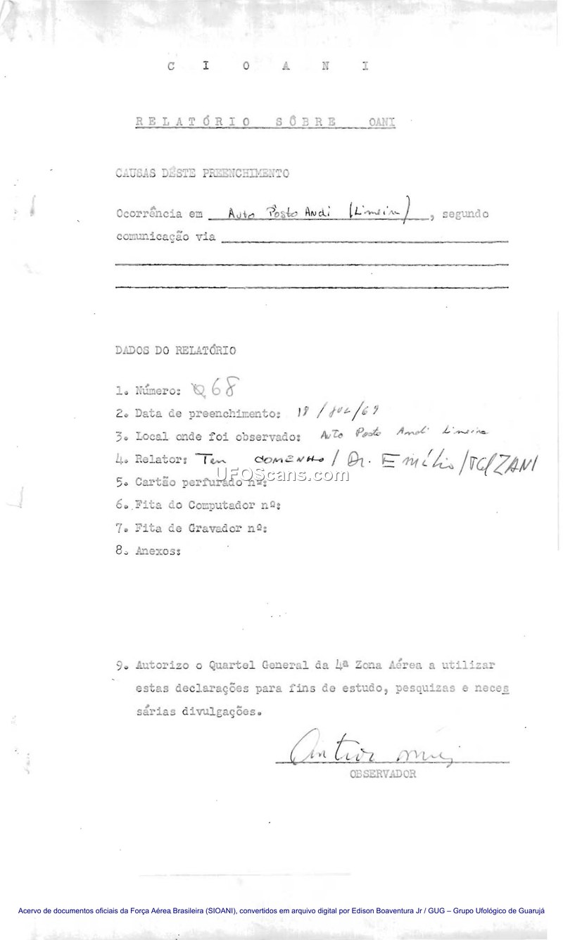 This document is a formal SIOANI (Sistema de Investigação de Objetos Aéreos Não Identificados) report, numbered 068, detailing a sighting that occurred on January 9, 1969, in Limeira, São Paulo, Brazil. The primary witness, Antenor Muniz, a 40-year-old merchant, reported observing an unidentified aerial object (OANI) while at the 'Auto Posto Andi' gas station. According to the report, the object was disc-shaped, approximately 3.5 to 4 meters in diameter, and hovered near the ground for about 15 minutes. The witness described the object as rotating counter-clockwise and emitting a strong orange light. The report notes that the observation was made with the naked eye under clear, warm weather conditions. The document includes a section for psychological and physical data on the observer, noting he was in a normal state at the time. The report also contains sketches of the object, which resemble a classic flying saucer with a spotlight. Press clippings included in the file indicate that the sighting caused significant local panic, with reports of other witnesses at the scene and the involvement of the local police and the 'Radio Jornal do Povo'. Despite extensive searches by authorities, no physical traces or evidence of the object were found. The document serves as a primary record of the investigation conducted by the Brazilian Air Force's SIOANI unit.