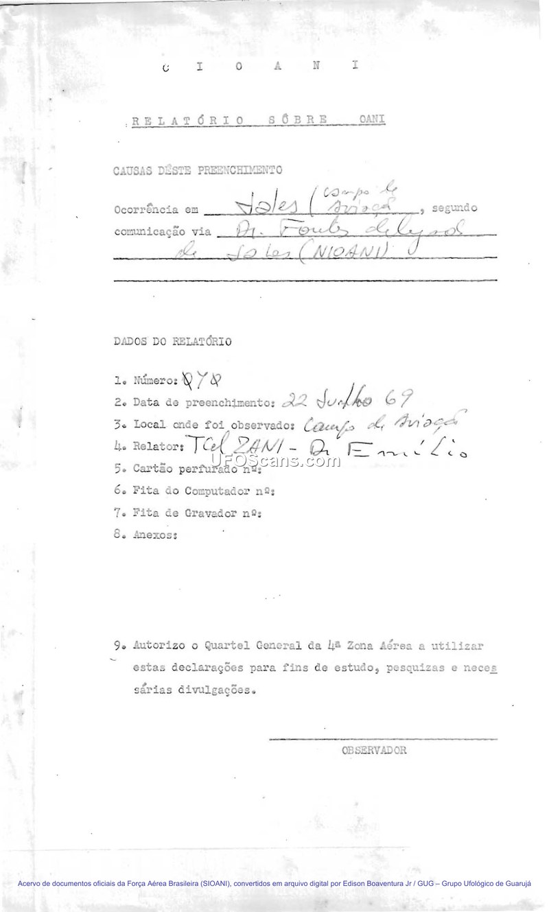 A 1969 SIOANI report detailing a sighting of a round, green and blue aerial object in Jales, Brazil. The witness observed the object for 15 minutes as it descended and emitted a red light.