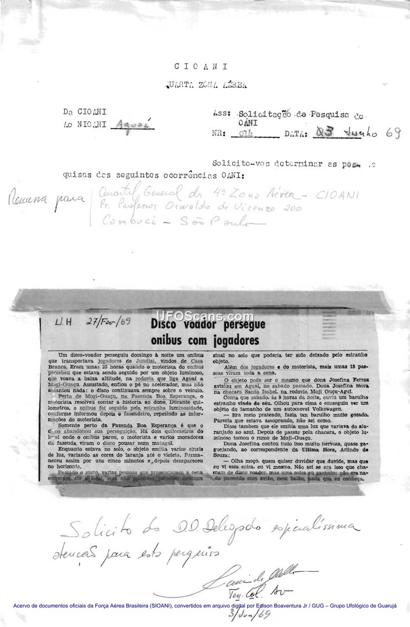 This document is a collection of reports and correspondence regarding an Unidentified Aerial Phenomenon (OANI) sighting in the region of Mogi-Guaçu and Aguaí, Brazil, in February 1969. The primary incident involves a bus driver transporting players from Jundiaí on the night of February 23, 1969. The driver reported being followed by a luminous object at low altitude for several kilometers. The object reportedly landed in a thicket near Fazenda Boa Esperança, where it remained for approximately five minutes, emitting light that shifted between orange and violet before disappearing on the horizon. The report notes that approximately 15 passengers witnessed the event. A secondary account is provided by a resident, Dona Josefina Ferraz, who reported seeing a silver, Volkswagen-sized object on the previous Saturday, which made a 'blowing' noise and emitted light. The document includes a formal request from the Fourth Air Zone (CIOANI) to the local police in Aguaí to investigate the occurrence. However, a subsequent official letter from the Aguaí Police Department, dated August 18, 1969, states that they were unable to locate the primary witness to complete the requested questionnaire, despite extensive inquiries in the area. The file also contains blank standardized reporting forms used by the SIOANI for documenting such sightings.