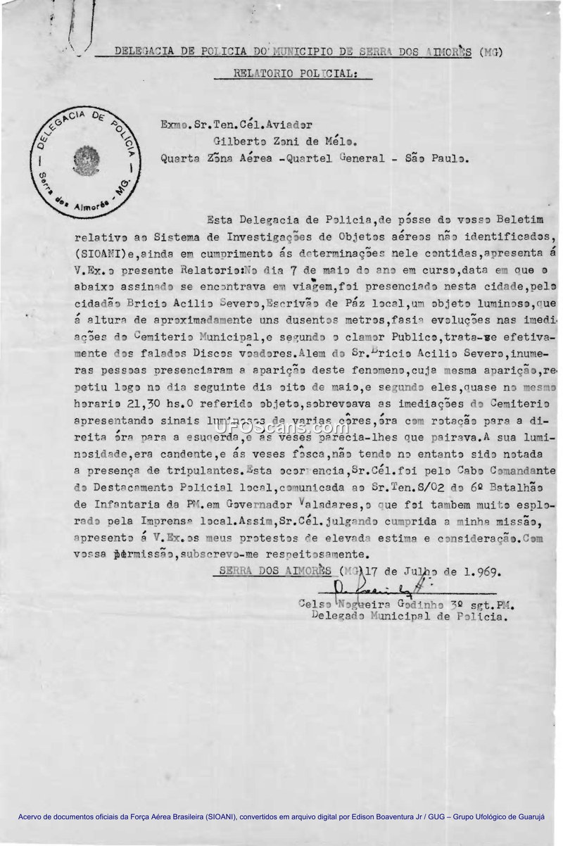 A 1969 police report from Serra dos Aimorés, Brazil, documenting a two-night sighting of a luminous, rotating aerial object by a local notary clerk and other residents. The report was submitted to the Brazilian Air Force's SIOANI project for investigation.