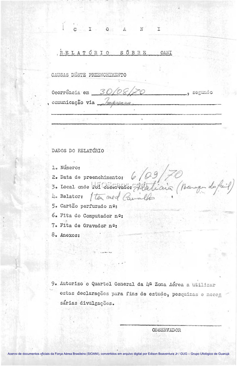 Relatório Sobre OANI — Itatiaia, 30/08/70