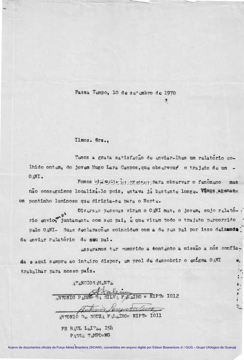 This document is an official sighting report from the Brazilian Air Force (SIOANI) regarding an Unidentified Aerial Phenomenon (OANI) observed in Passa Tempo, Minas Gerais, on September 6, 1970. The primary witness, 16-year-old Hugo Lara Campos, reported seeing a luminous object at approximately 20:00 hours. According to the report, the object appeared as a yellow, star-like light that moved from the west toward the east at a speed comparable to an airplane. It then changed direction to the north, increased in size to roughly that of a saucer, and slowed down. The witness noted that the object was solid and opaque, emitted reflections, and did not blink or produce any noise. The report includes a detailed questionnaire regarding the observer's background, the environmental conditions at the time of the sighting, and a technical description of the object's behavior. The document also features a hand-drawn diagram illustrating the object's trajectory and its change in appearance. The report was finalized on September 10, 1970, by investigators Antonio Pedro da Silva Faleiro and Antonio de Souza Faleiro.
