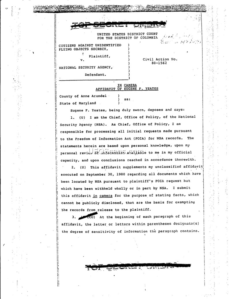 This document is an in camera affidavit submitted by Eugene F. Yeates, Chief of the Office of Policy at the National Security Agency (NSA), to the United States District Court for the District of Columbia. The affidavit was prepared in response to a Freedom of Information Act (FOIA) lawsuit filed by the organization 'Citizens Against Unidentified Flying Objects Secrecy' (Civil Action No. 80-1562). The primary purpose of the affidavit is to justify the NSA's decision to withhold 156 communications intelligence (COMINT) reports related to UFOs or UAP. Yeates explains that the NSA located 239 documents in total, but many were referred to other agencies or withheld based on national security exemptions. The affidavit details the classification system used by the NSA, specifically noting the 'UMBRA' codeword for Category III COMINT. Yeates argues that the withheld documents contain sensitive information regarding signals intelligence (SIGINT) operations, including the interception of foreign government communications. He asserts that disclosing these reports would reveal the NSA's capability to target specific communications systems, thereby compromising intelligence sources and methods. The document discusses specific examples of withheld records, including reports of radar operators tracking unidentified objects, and explains that some of these reports are considered fictitious by NSA analysts. Yeates emphasizes that the protection of intelligence sources and methods is paramount and that the information is exempt from disclosure under various statutes, including 5 U.S.C. §552(b)(1), (3), and (5), as well as 18 U.S.C. §798 and 50 U.S.C. §403(d)(3). The affidavit concludes with a request for the Court to maintain the security of the document and return it to the Department of Justice.