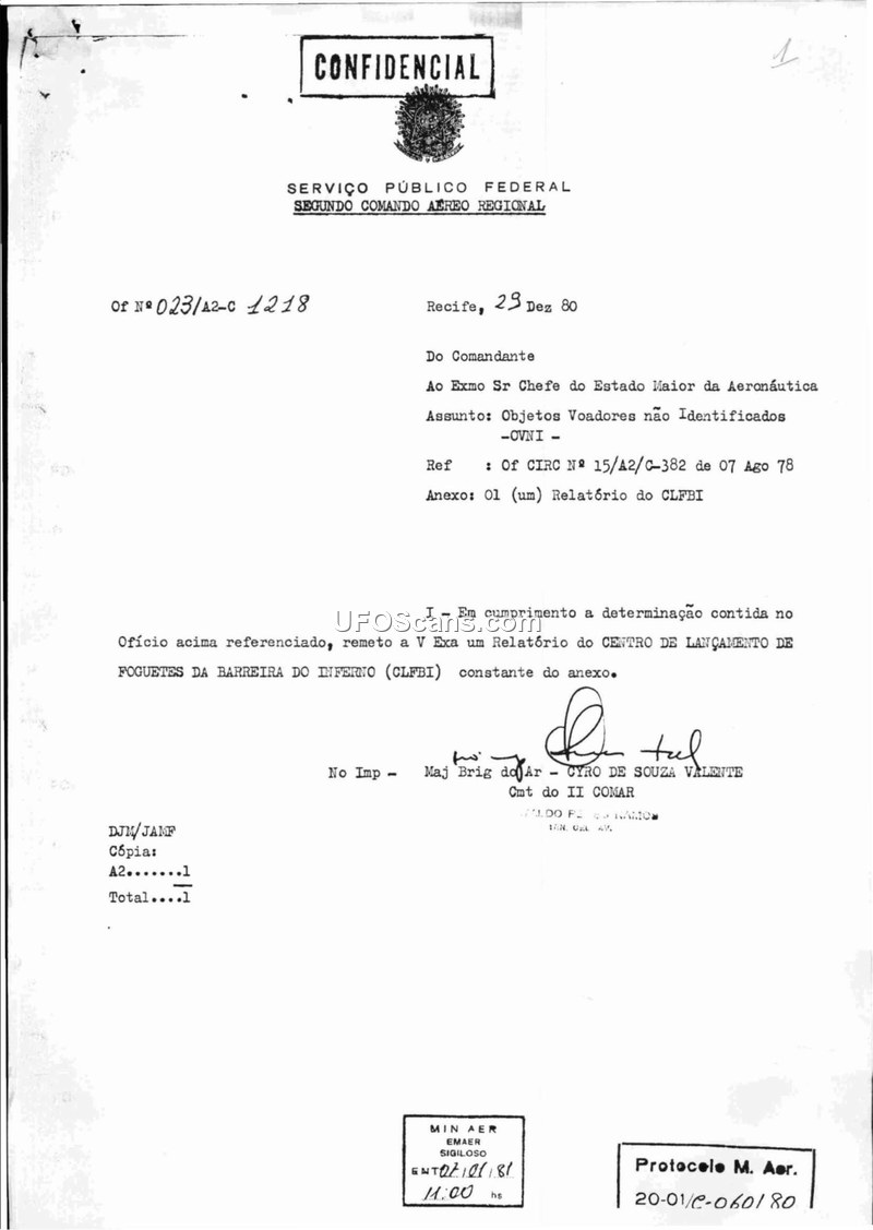This document is a formal report from the Brazilian Ministry of Aeronautics regarding an incident on July 27, 1980, involving the tugboat CAIOBA SEAHORSE. The crew reported sighting an unidentified, intensely illuminated object near Touros, Rio Grande do Norte. The report compiles testimonies from the crew of the CAIOBA SEAHORSE and the nearby vessel TECHE SEAHORSE. The witnesses described a white, oval-shaped object that appeared to hover near the bow of the CAIOBA SEAHORSE before moving to the starboard side and eventually departing rapidly. The commander of the CAIOBA SEAHORSE, who was suffering from severe food poisoning at the time, believed the object to be a 'flying saucer' and ordered a report to be sent to Natal Radio. The investigation, led by Ten Cel Av Francisco José Rennemann Filho, analyzed the testimonies, radar data, and meteorological conditions. It concluded that the sightings were likely misidentifications of a conventional vessel. The report highlights significant inconsistencies in the crew's accounts, particularly regarding the object's behavior, position, and the timing of the events. The investigator suggests that the commander's illness and the crew's lack of technical training contributed to the misinterpretation of the visual phenomena. The report ultimately dismisses the possibility of an unidentified aerial vehicle, attributing the incident to a conventional boat and the psychological state of the witnesses.