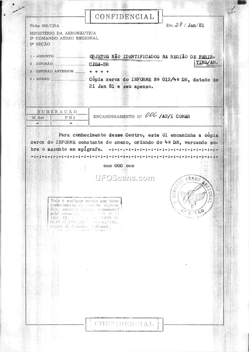 The documents record multiple UAP sightings in Brazil between 1980 and 1981, including a specific incident in Morrinhos where an object allegedly crashed into a reservoir, leading to reported health complications for witnesses. Military authorities monitored these events, noting the potential for public alarm caused by sensationalist media coverage.