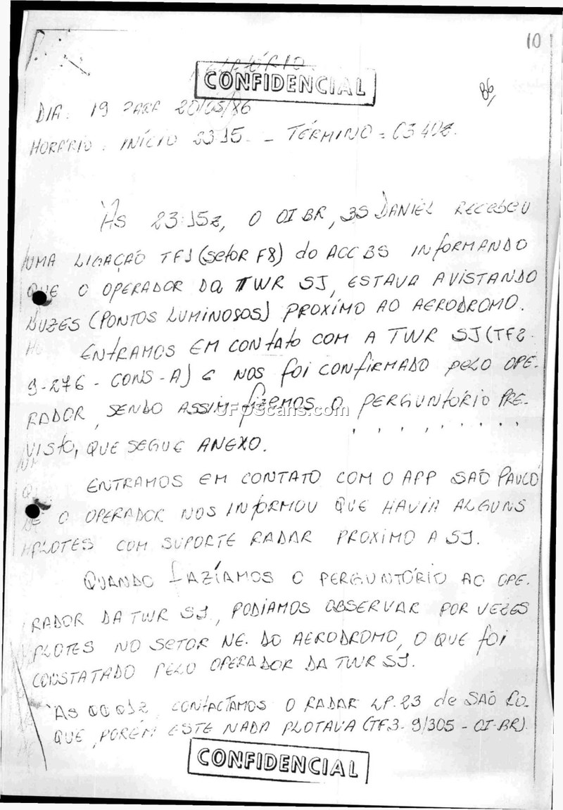 This document is a comprehensive collection of reports, logs, and press clippings regarding a series of Unidentified Aerial Phenomena (UAP) incidents that occurred in Brazil on the night of May 19-20, 1986. The events began when the tower at São José dos Campos reported unidentified lights near the aerodrome. This triggered a massive military response involving the Brazilian Air Force (FAB), including the scrambling of Mirage and F-5E fighter jets from Anápolis and Santa Cruz. Throughout the night, radar operators at Cindacta and pilots in the air tracked multiple unidentified targets. Pilots reported visual contact with lights that changed color—pulsing between green, red, and white—and exhibited extreme speeds and evasive maneuvers, including ziguezague patterns. Several pilots attempted to intercept the objects, but were unable to close the distance or maintain a stable radar lock, as the objects would often disappear or move away at high speeds. The document includes detailed transcripts of the incident logs, individual reports from the pilots involved, and subsequent press coverage. The Minister of Aeronautics, Brigadeiro Octávio Moreira Lima, publicly acknowledged the events, describing them as 'inexplicable' and 'fantastic,' while noting that the objects were detected by radar and seen by multiple witnesses. The reports highlight that the objects did not follow standard flight patterns and that onboard aircraft instruments, such as the HSI and DME, experienced interference during the encounters. The document also contains later analysis and commentary from the Brazilian Society for the Study of Flying Discs (SBEDV), which contextualizes these events within a broader history of UAP sightings in Brazil and discusses various theories, including extraterrestrial origins and potential electronic warfare.