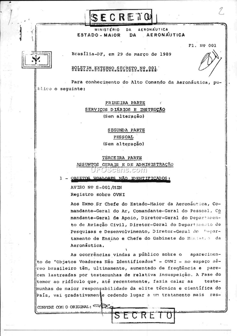 This document is a compilation of official Brazilian Air Force (FAB) bulletins, memoranda, and correspondence regarding the investigation of Unidentified Aerial Phenomena (UFOs/OANIs). It details the establishment and operation of the SIOANI (System for the Investigation of Unidentified Aerial Objects), created in 1969 under the 4th Air Zone (COMAR) in São Paulo. The document provides a historical overview of how the FAB managed UFO reports, transitioning from the SIOANI to the NUCOMDABRA (Nucleus of the Aerospace Defense Command of Brazil) by the late 1980s. It includes internal directives, such as the 'Diretriz Específica 04/89', which established standardized procedures for military control organs to follow when encountering UFOs, including radar monitoring, video recording, and the use of a standardized questionnaire for witnesses. The compilation also features numerous case reports (CI-001 through CI-070) from the late 1960s, detailing witness accounts, physical descriptions of objects, and the military's attempts to categorize these sightings. The document highlights the military's dual approach: maintaining secrecy regarding official investigations while acknowledging the need to systematically document and analyze phenomena that could not be ignored. It includes correspondence with civilian researchers, such as Osni Schwarz, demonstrating the military's interaction with the civilian ufological community. The document serves as a record of the institutionalization of UFO research within the Brazilian military, emphasizing the importance of scientific rigor, the collection of physical evidence, and the maintenance of operational security.