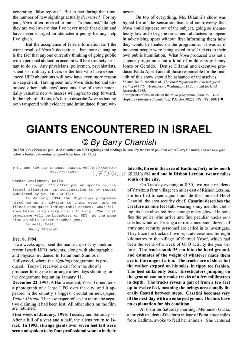 This document, published in FSR 39/4, consists of reports by Barry Chamish regarding a series of UFO sightings and encounters with 'giants' in Israel between 1993 and 1995. Chamish details several specific incidents, including the sighting of a nine-foot-tall entity by security chief Herzl Casatini in Yatzitz, which allegedly resulted in a medical condition for the witness. Other reports involve Memuneh Guata and Hanna Samech, who describe encounters with entities and telepathic communication. The document notes physical evidence, such as circular traces in vegetation, cadmium-based oil, and silicon shards. The author also discusses the involvement of the television programme 'Sightings,' which filmed in Israel but faced delays in broadcasting the footage. Additionally, the document includes a separate section by Donna Higbee, a hypnotherapist, discussing the psychological phenomenon of 'abductee brainwashing' and the tendency for abductees to adopt positive interpretations of their experiences, which she compares to the Stockholm Syndrome. The overall narrative suggests a pattern of high-strangeness events in Israel, characterized by the presence of tall entities and associated physical and physiological anomalies.