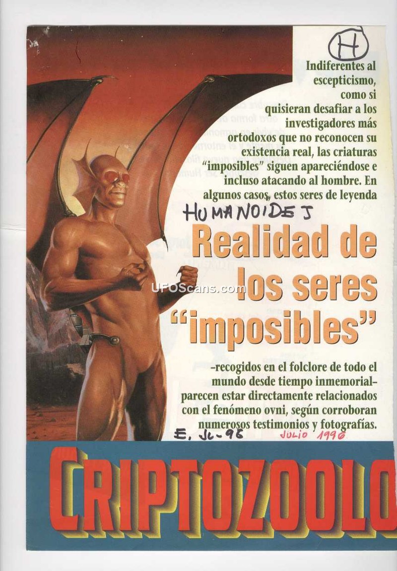 This document, published in the July 1996 issue of Enigmas magazine, explores the intersection between cryptozoology and the UFO phenomenon. It argues that creatures traditionally dismissed as folklore or biological impossibilities—such as hairy bipeds (Bigfoot, Yeti, 'Maloliente'), winged humanoids, and the 'Chupacabras'—are not isolated biological entities but are manifestations related to the UFO phenomenon. The text suggests that these entities appear in specific 'windows' of activity and are often accompanied by luminous spheres or metallic craft. The article cites various historical and contemporary accounts, including the 1948 Washington sighting by Bernard Zaikowski, the 1976 Florida incident involving Donald Duncan, and the 1980 Puerto Rican 'Garadiávolo' case. It references researchers like Ivan T. Sanderson, John A. Keel, and Jacques Vallée, who have proposed that these phenomena are not purely extraterrestrial in the conventional sense but may originate from 'another reality.' The document details physical evidence, such as footprints and remains, and notes that these creatures often exhibit hostile behavior toward humans and livestock. It concludes that the persistence of these reports, despite scientific skepticism, suggests a complex, interconnected mystery that defies standard biological classification.