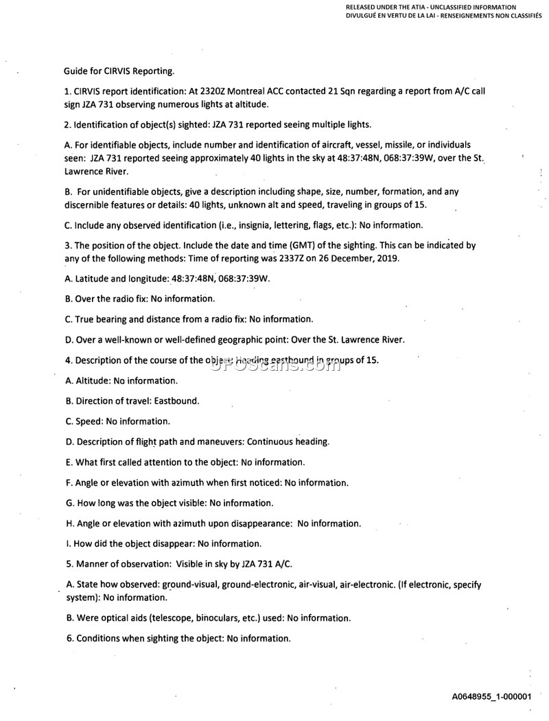 This document is a compilation of daily operational logs from the Canadian Air Defence Sector (CADS) spanning from 2010 to 2020. The logs serve as a record of daily activities, including system maintenance, code changes, and the receipt of various reports, including those categorized as CIRVIS (Communication Instructions for Reporting Vital Intelligence Sightings) or general UFO reports. Throughout the decade, CADS personnel documented numerous sightings reported by civilian and military pilots, as well as members of the public. These reports describe a variety of phenomena, such as bright lights, fireballs, and unidentified objects. For instance, a 2010 entry describes a red disk with a blue ring observed in Repentigny, Quebec, while a 2013 entry details a large bright orb the size of a football field reported near Winnipeg. Many of these reports were forwarded to Mr. Chris Rutowski for further review, and in several instances, the reports were assessed by the Mission Crew Commander (MCC) as non-threats to North American security. The logs also reflect the routine nature of these reports, often noting that they did not meet the strict criteria for a formal CIRVIS report or were likely attributable to natural phenomena such as stars, meteors, or space debris. The document provides a chronological record of how these reports were handled, processed, and communicated within the Canadian military and civil aviation infrastructure.