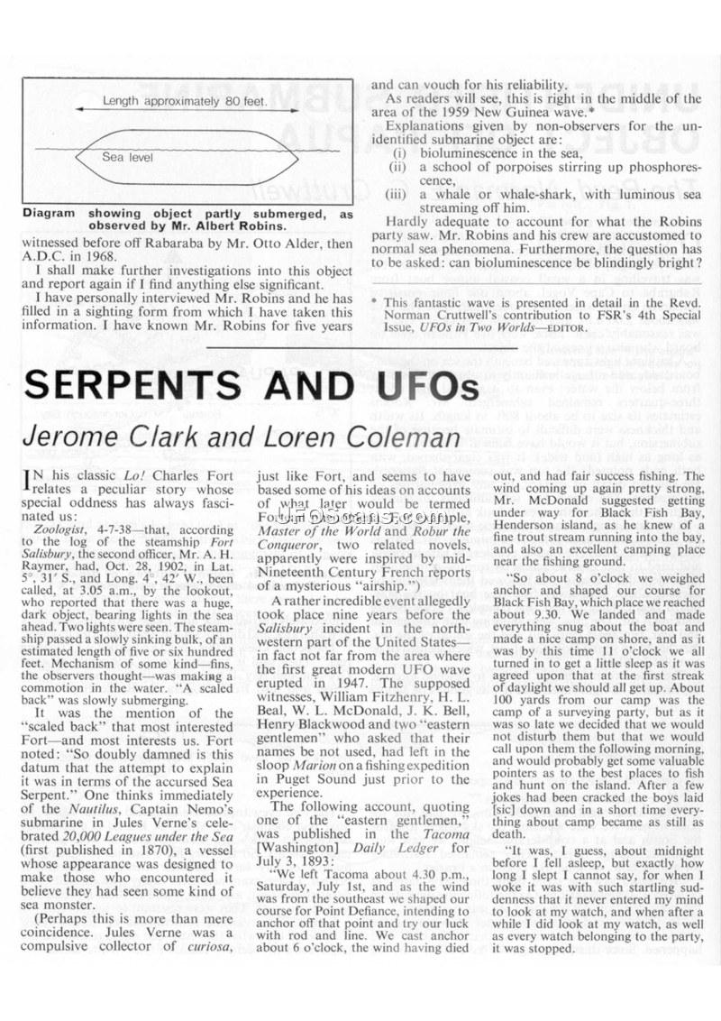 This document is a compilation of articles discussing the intersection of UFO sightings and reports of serpent-like creatures. It begins with a report by Mr. Albert Robins regarding an object observed in 1968. The text then transitions into an analysis by Jerome Clark and Loren Coleman, who examine historical accounts of 'serpents' and 'airships' dating back to the 19th century, including the 1902 sighting by the steamship Fort Salisbury and a 1947 incident involving the sloop Marion. These accounts often describe objects with metallic scales, propellers, and electrical properties that affect human witnesses and mechanical devices like watches. The document also includes a section by Janet Bord, which investigates whether individuals with psychic sensitivity are more prone to witnessing UFOs, citing the case of Charlie Jones in Indiana, who reported multiple sightings of orange and blue-white objects between 1947 and 1965. The narrative weaves together folklore, historical maritime reports, and modern UFO sightings to suggest that these phenomena may be part of a broader, unexplained category of events that challenge conventional understanding.
