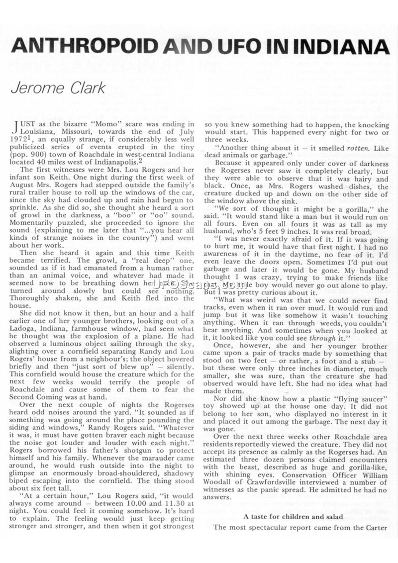 This document compiles reports of 'hairy, humanoid' creatures associated with UFO sightings in Roachdale, Indiana, and Aznacóllar, Spain. In Indiana, during the summer of 1972, residents reported a large, hairy, black creature that emitted a growling sound and smelled of rotting garbage. Witnesses, including the Rogers family and the Burdine family, described the creature as having glowing eyes and being approximately ten feet tall. The creature was linked to the death of over 100 birds and livestock on the Burdine farm, where it was also observed blocking light in a chicken house. Conservation Officer William Woodall investigated these reports but found no concrete physical evidence. In a separate account from September 1971 in Aznacóllar, Spain, a shepherd named Juan Rodríguez Domínguez reported seeing a large object land on a farm, followed by the appearance of entities he described as 'men' walking on the ground. The authors, Jerome Clark and Ignacio Darnaude, suggest that these 'anthropoids' may be related to UFO occupants, noting that these sightings often occur in the same geographic areas as conventional UFO reports.