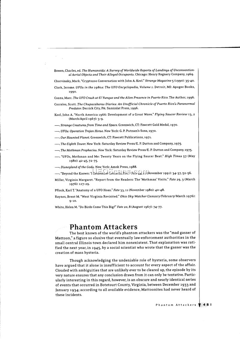It must also be said that the irrational, even nonsensical nature of the Mattoon and Botetourt events leads us to conclude that whatever its limitations, the hysteria solution seems the only alternative to the far more extraordinary one, that the 'mad gassers' stepped out of the Goblin Universe.