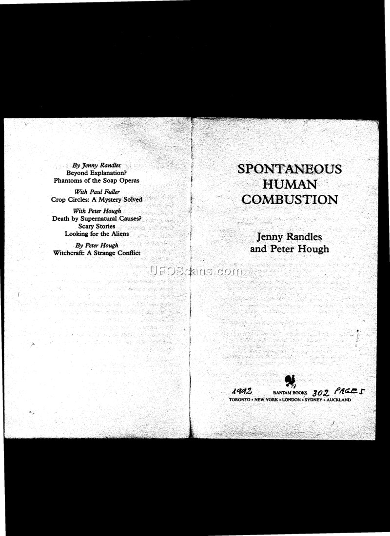 This document consists of the front matter and table of contents for the 1992 book titled 'Spontaneous Human Combustion' by authors Jenny Randles and Peter Hough. The book is published by Bantam Books and contains 302 pages. The content is divided into two main parts: 'The Evidence' and 'The Theories'. Part one covers historical and specific case studies, including the death of Mary Reeser, the experiences of Jack Angel, and investigations by figures such as Senior Divisional Officer Tony McMunn and Dr. Terence Meaden. Part two explores various theories regarding the phenomenon, ranging from chemical reactions to more speculative concepts like 'The Kundalini Fire'. The document also includes a list of illustrations, which features photographs related to fire investigations, cemetery registers, and individuals involved in the study of spontaneous human combustion. The book serves as a comprehensive examination of the subject, providing both case abstracts and theoretical analysis.