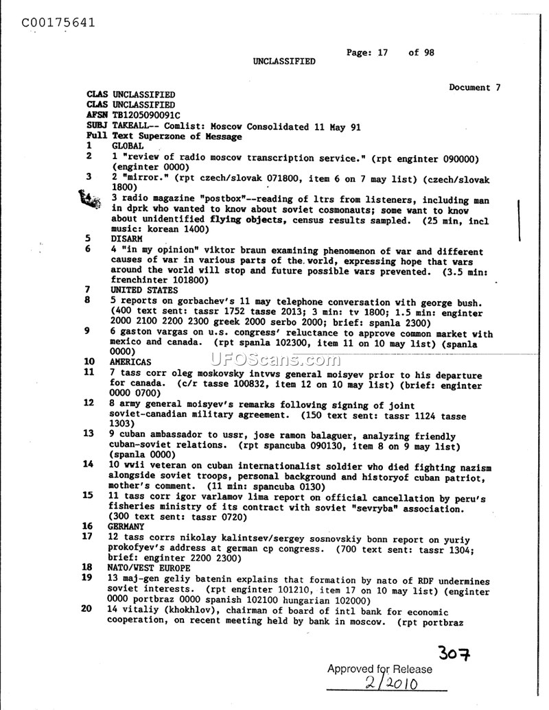 This document is a May 11, 1991, intelligence summary of global news reports from Radio Moscow and TASS. It covers diverse topics including international diplomacy, Soviet internal politics, military affairs, and a brief mention of listener inquiries regarding UFOs.
